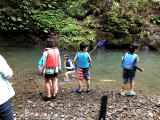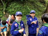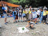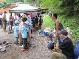 | 光滝寺キャンプ場でカブ隊と一緒に川遊びをしました。この数日間の大雨で水量が多く、滝つぼ遊びは 出来ませんでしたが、冷たい水に肩まで入って楽しんだり、生き物を探したり…思い思いにすごしましたよ。 焚き火で体を温めたらお昼ごはんです。団委員さんが炭火で焼いてくれた焼き鳥とフランクフルトは とても美味しかったね。スイカ割りも楽しんで、梅雨の中休みを自然の中で大いに満喫しました。 |