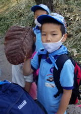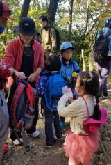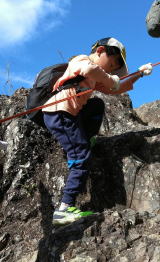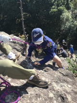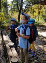 | ビーバー隊では、3年ぶりに二上山に登りました。 行きは細い山道、帰りはゴツゴツ岩の道をドキドキしながら、団委員さんが張って下さってたロープを頼りに 下山しました。 野鳥が見られるポイントで、みんなが一斉にバードコールを鳴らしたので、1羽だけいた野鳥が混乱して いました(野鳥さんゴメンナサイ!) �鳥の大群の鳴き声が聞こえるのに、いるのは水色の人間の子供の大群!(笑) |